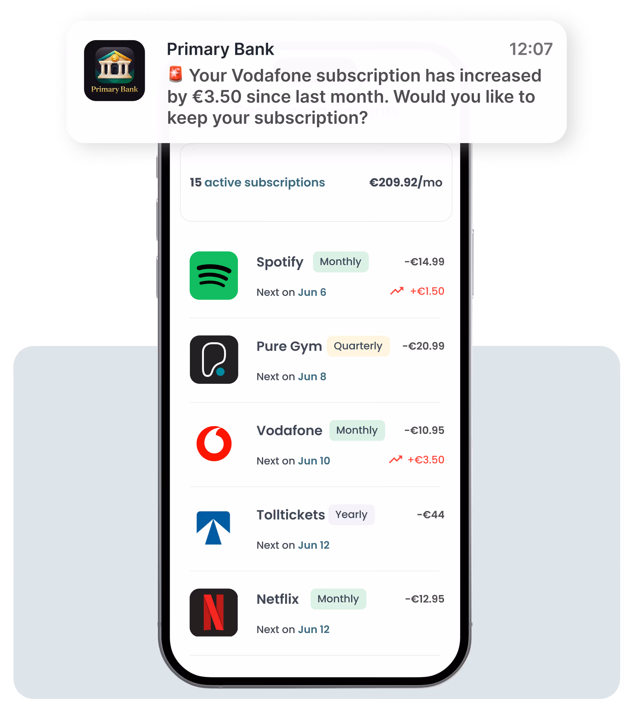 Make recurring payments transparent, manageable, and predictive. Establish structured recurring intelligence to strengthen engagement, prevent churn to digital-first competitors, and secure primary account status.